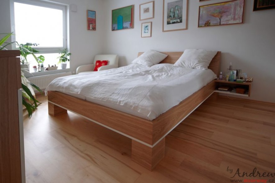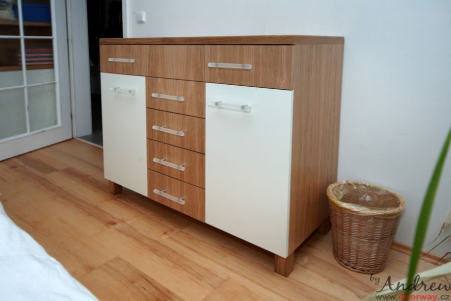 Pro zajímavost posuvné dveře mají čidlo a při otevření dveří je rozsvícená celá šatna. Po šatně náasledovaly ještě zpracovánínávrhů postele a komody ve stejném stylu jako šatna.