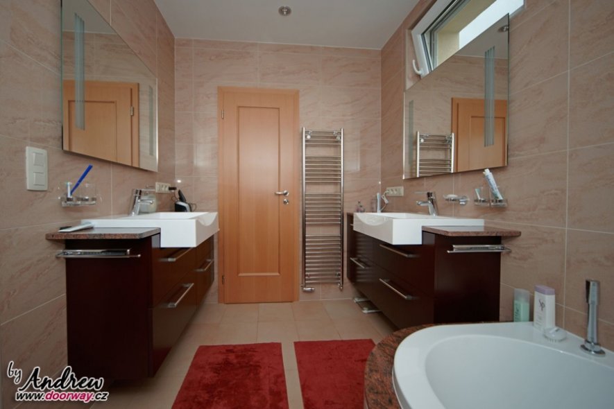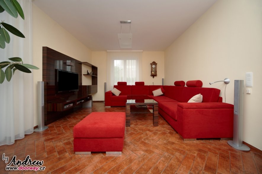 Základním prvkem tohoto domu bylo rozšíření o horní patro, které nám umožnilo vybavit ložnici, koupelnu, dětský pokoj a pracovnu. Posléze na spodním patře obývací stěnu s konferenčním stolkem. Obývací stěna