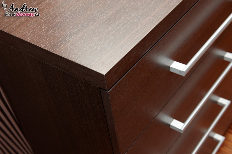 Postupem po horním patře můžeme projít ložnicí - dýha wenge v kombinaci s mléčným sklem a pracovnamiv provedení lamino už jen dotváří celkový ráz domu.