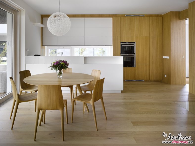V celé vile se opakuje stejná dubová podlaha, nábytek - základní prvky - dýha dub rovnoletý v laku a některé prvky stříkané